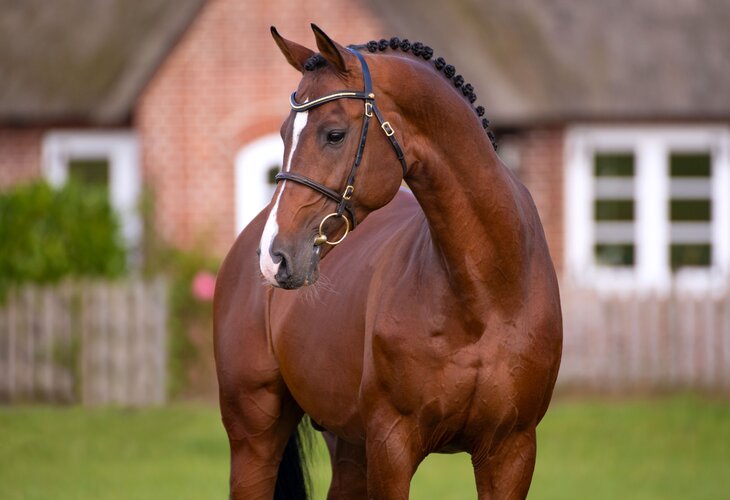 Besonders beeindruckend sind die Fohlenjahrgänge des Dinken: hervorragend im Typ und mit Energie und bestem Bewegungspotential ausgestattet zelebrieren sie ihre Auftritte. Da überrascht es nicht, dass die Prämierungsquote der 2024 beim Holsteiner Verband registrierten Nachkommen von Dinken bei 91 Prozent lag. 2023 Jahr siegte seine Tochter im Fohlenchampionat in Lienen bei den Stutfohlen. Und auch im Holsteiner Landesfohlenchampionat 2025 siegte ein herausragender Dinken-Sohn (MV. Chin Champ) im Klassement der Hengstfohlen deutlich.