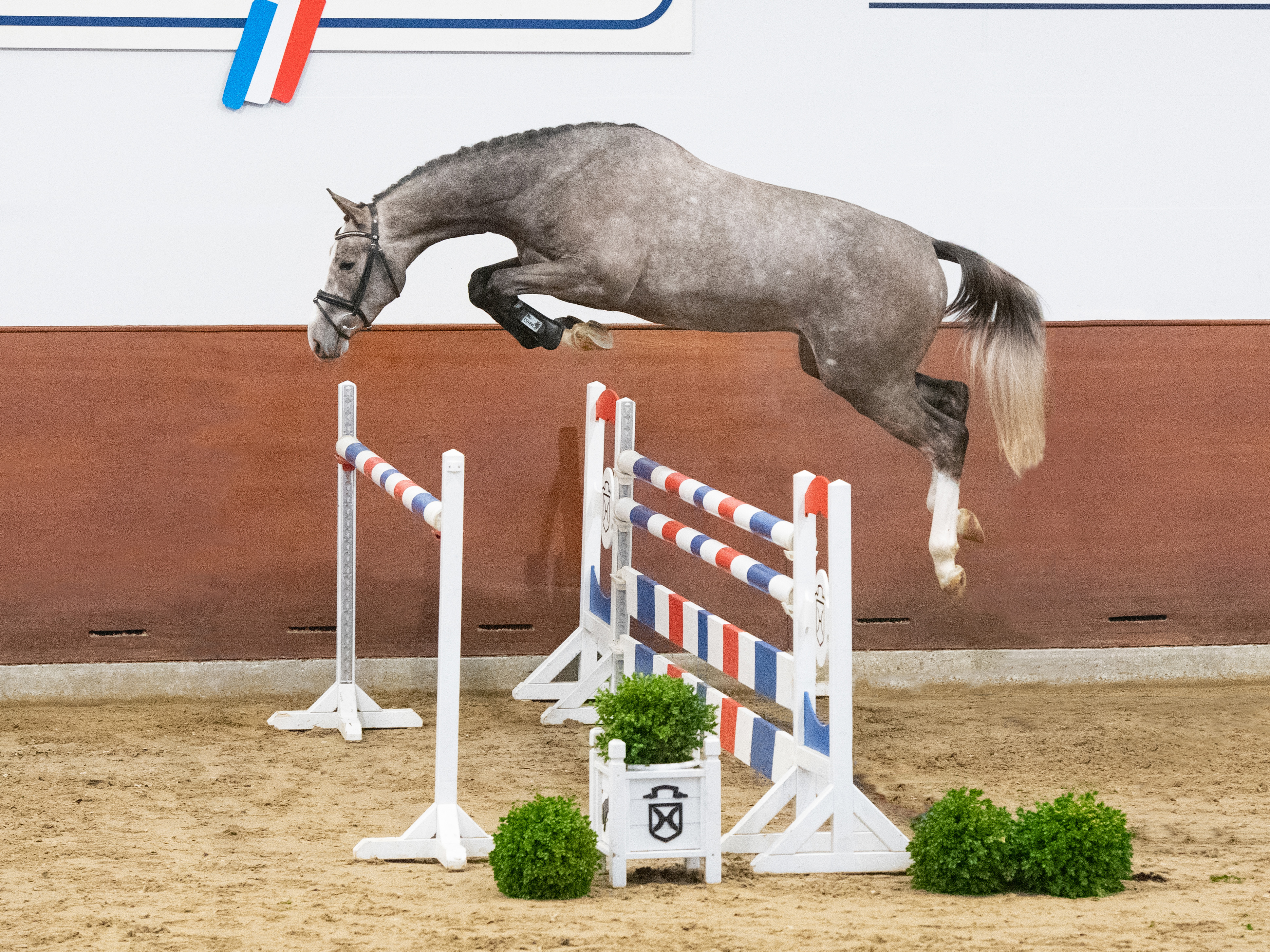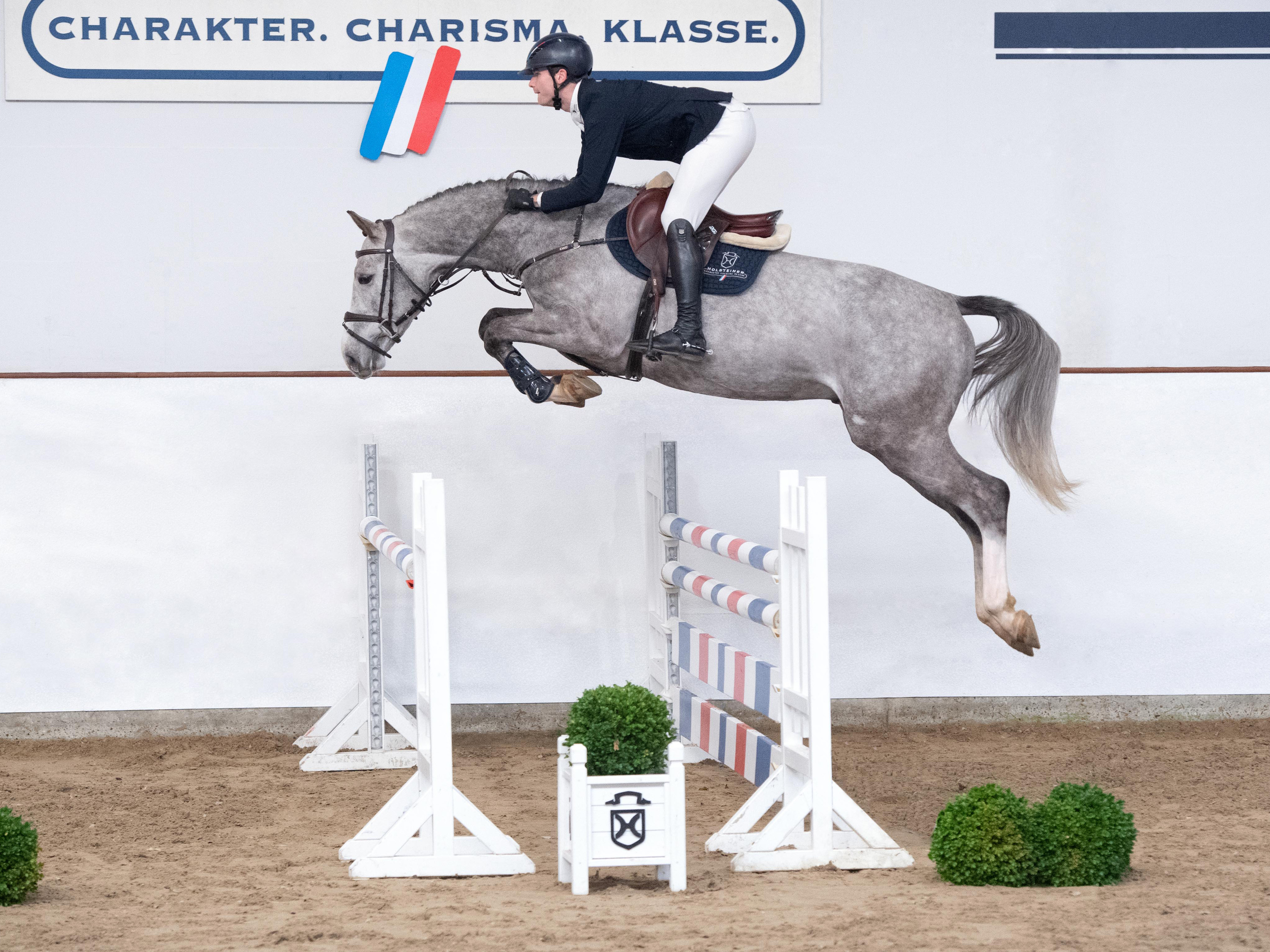 Mit der gewichteten springbetonten Endnote von 8,30 schloss der Schimmel unter Lucas Wenz die Kurz-Veranlagungsprüfung in Vechta ab. „Ein Springer“, lautete die Zusammenfassung der Bewertungskommission, die United Pleasure eine 9,0 für die Leistungsbereitschaft und eine 8,8 für die Springanlage eintrug. Besonders beim Freispringen fiel der vermögende Schimmel auf: „Ein Hengst, der mit unglaublich viel Vermögen ausgestattet ist. Mit viel Go hat er dennoch gute Übersicht am Sprung – das wird ihm sicherlich noch zugutekommen.“ United Pleasure vergoldete unter Lucas Wenz gleich seine erste Turniersaison: Die beiden gewannen mehrere Springpferdeprüfungen und wurden bei den Holsteiner Pferdetagen souverän zu Landeschampions gekürt. Aus seinem ersten Fohlenjahrgang konnte sich ein United Pleasure-Sohn direkt zum Landesfohlenchampionat in Elmshorn empfehlen.