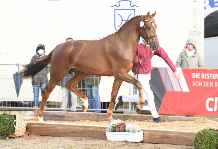 Der Siegerhengst des Jahres 2020 ist mittlerweile ein hochdekorierter Multi-Champion der Elmshorner Hengstriege. Er ist mit allerbesten Sportpferdeeigenschaften ausgestattet und beeindruckt durch seine Leistungsbereitschaft, Cleverness und Rittigkeit. Seine Auftritte sind vor allem von einer Souveränität geprägt, die ihresgleichen sucht. Im Beritt von Lucas Wenz sprang er 2024 zu ersten internationalen Platzierungen und qualifizierte sich zum Bundeschampionat. In der abgelaufenen Saison setzte er seine Erfolge fort, gewann mehrere internationale Youngster-Touren, Bronze im Landeschampionat und platzierte sich auf dem Bundeschampionat und bei den Weltmeisterschaften der jungen Springpferde.