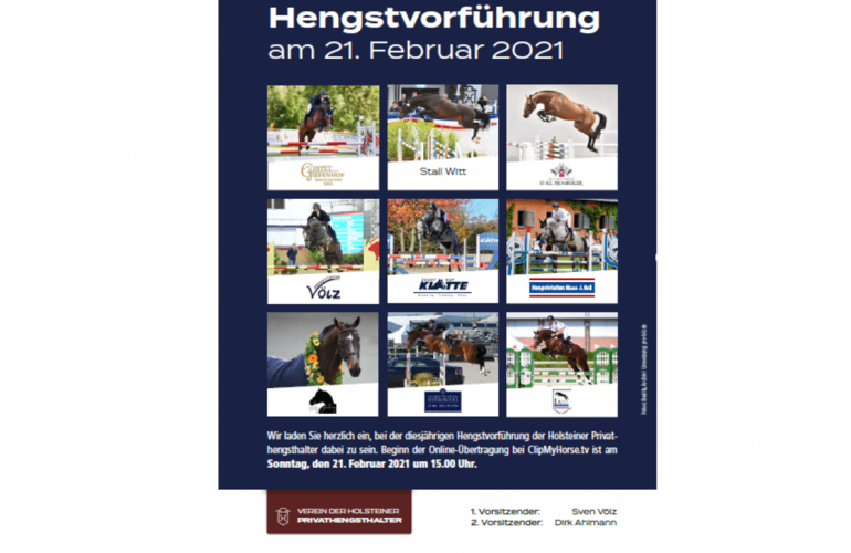 Der Verein der Holsteiner Privathengsthalter lädt Sie herzlich ein, bei der diesjährigen Hengstvorführung dabei zu sein. Beginn der Online-Übertragung bei ClipMyHorse.tv ist am Sonntag, den 21. Februar 2021 um 15 Uhr.