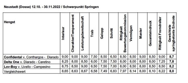 Mit einer 50-tägigen Stationsprüfung für springbetonte Hengst in Neustadt/Dosse hat die Hengstleistungsprüfungssaison 2022 weitgehend ihren Abschluss gefunden. Zusammen mit den 36 Kandidaten dieser Prüfung haben in diesem Jahr insgesamt 117 Junghengste erfolgreich einen 50-Tage-Test absolviert. 116 stellten sich einer Sportprüfung und 180 stellten in einer verkürzten Veranlagungsprüfung ihre Qualität auch unter dem Sattel unter Beweis, 53 Hengste in einer Kurz-VA organisiert durch die FN, 127 Hengste bei den jeweiligen Mitgliedszuchtverbänden (Oldenburg noch ausstehend).