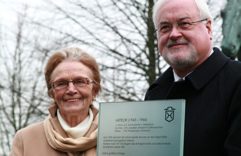 Foto: Anneliese Thiedemann und Peter Harry Carstensen vor der Meteor-Statue in Kiel.