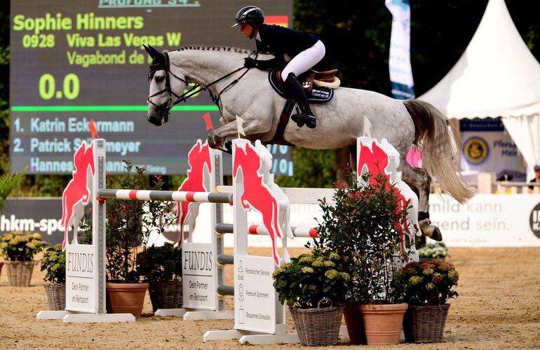 Heute haben die HKM-Bundeschampionate begonnen. Den Auftakt machten die sechjährigen Spring- und die fünfjährigen Dressurpferde sowie bei den Reitpferden die vier Jahre alten Stuten und Wallache. Und sogleich beim Auftakt konnte ein Pferd mit einem Holsteiner Abstammungsnachweis einen Sieg davontragen. Die Rede ist von der sechs Jahre alten Viva Las Vegas v. Vagabond de la Pomme-Cancara aus der Zucht von Matthias Wittke aus Marienheide. Mit Sophie Hinners im Sattel sprang die Schimmelstute zu einer 9,1 und entschied damit eine Abteilung der Prüfung für sich.