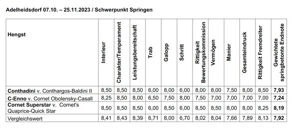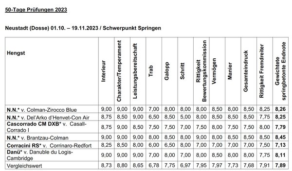 Folgend aufgeführt sind alle Holsteiner Hengste – unabhängig von ihrem Körstatus beim Holsteiner Verband und vom Prüfungsergebnis. In Holstein nicht gekörte Hengste werden mit * markiert dargestellt. Das sind die Ergebnisse: