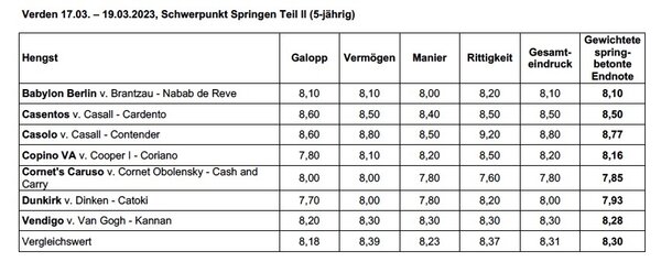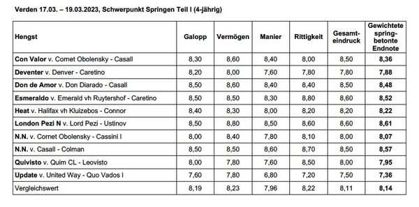 Aufgeführt sind alle Holsteiner Hengste – unabhängig von ihrem Körstatus beim Holsteiner Verband und vom Prüfungsergebnis. Das sind die Ergebnisse: