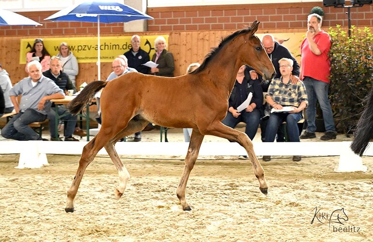 Zum siegreichen Stutfohlen avancierte eine Tochter v. Casall a.d. Marilyn Monroe v. Diamant de Semilly (Zuchthof Hollen, Oyten), Stamm 104A. Sie ist nicht nur eng verwandt mit Marlene v. Don, die auf der Holsteiner Frühjahrsauktion 2023 zum Spitzenpreis von 180.000 Euro in die USA zugeschlagen wurde. Auch Parcours-Athleten wie Havanna v. Crumble (Cristina Toda/ESP) gehören zur Familie.