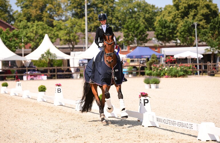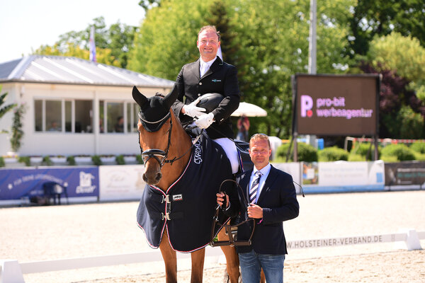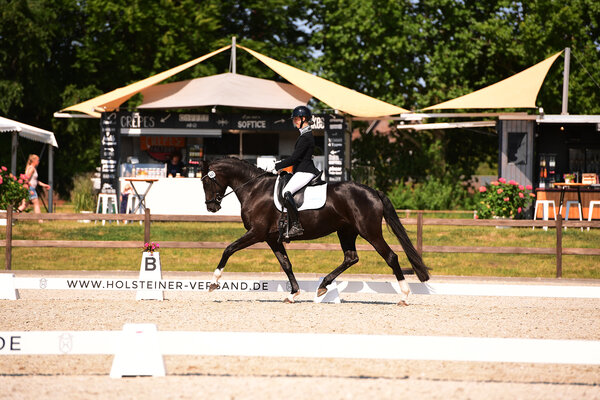 In der Dressurpferdeprüfung der Klasse L gab es ein Wiedersehen mit einem bereits hochdekorierten jungen Holsteiner: Im vergangenen Jahr gewann Robby Brown v. Rock Forever I-Aljetto (ZG Ellerbrock, Kayhude) mit Christina Ellendt unter anderem die Bronzemedaille bei den Bundeschampionaten in Warendorf. Nun setzte er sich auch in Elmshorn mit einer Gesamtbewertung von 8,0 an die Spitze des Starterfeldes der Einlaufprüfung. Rang zwei mit einer Wertnote von 7,6 ging an Questore v. Quantensprung-Lorentin I (Klaus-Heinrich Petersen, Ahrenviöl) und Jan Lens. Dritte wurden Caramel v. Caracho-Aljano (Sönke Wilhelm Thamling, Kollmar) und Paula de Boer mit 7,5.