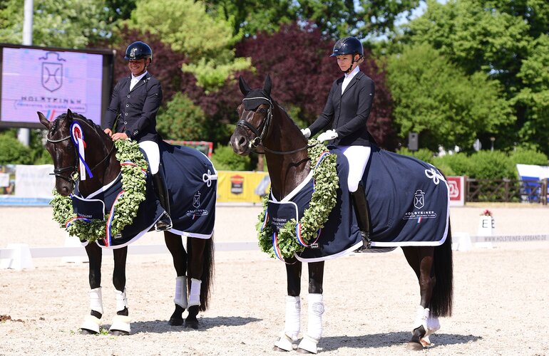 Am Freitagvormittag wurden auf dem Herbert-Blöcker-Platz die ersten Landeschampions des Jahres 2023 gekürt. In einer Dressurpferdeprüfung der Klasse L im Klassement der Fünfjährigen setzte sich Sir Mystic EA v. Sir Donnerhall-Fürst Heinrich (Elisabeth Christina Ahn-Ballies, Grebin) gegen die Konkurrenz durch. Mit Laura Wilms im Sattel trabte der Rappwallach zur einer Gesamtwertnote von 8,2 und bekam dafür bei der Championatsehrung den begehrten Eichenkranz umgelegt. Die Silbermedaille (7,7) sicherte sich Questore v. Quantensprung-Lorentin I (Claus-Heinrich Petersen, Ahrenviöl). Jan Lens hatte für das Gestüt Fohlenhof Platz im Sattel genommen. Auf der Bronzeposition rangierte Caramel v. Caracho-Aljano (Sönke Wilhelm Thamling, Kollmar). Paula de Boer hatte die braune Stute gesattelt und ein Wertnote von 7,5 erhalten. Die Siegerehrung im Landeschampionat der sechsjährigen Dressurpferde führte Black Jack JG v. Bon Coeur-Hofrat (Joana Graf, Bargfeldt-Stegen) an. Kaddur Kelkha ritt den Rapphengst zu einer Wertnote von 7,8. Auf dem zweiten Platz (7,5) folgte Fiorino Hit EA v. Fürst Romancier-Licotus (Elisabeth Christina Ahn-Ballies, Grebin) unter Laura Wilms. Die Bronzemedaille (7,5) vergab das Richterkollegium, das aus Gabriele von Appen, Tanja Konopka und John Mc Cormack bestand, an Belle de Jour v. Bon Coeur-Lorentin I (Nicole Hägler, Leonberg) unter Christian Busse.