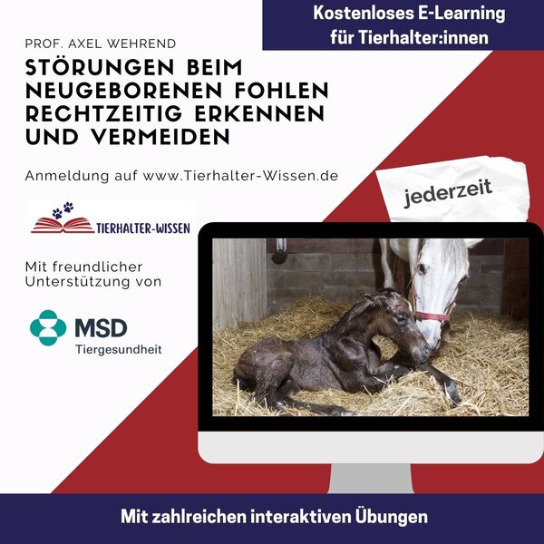 So langsam wird es Frühjahr und die ersten Fohlen werden geboren bzw. bis zum Abfohltermin ist es nicht mehr lange hin. Aus diesem Grund bietet das Tierhalterportal Tierhalter-Wissen.de mit freundlicher Unterstützung des MSD Tiergesundheit Züchtern die Teilnahme an einer kostenfreien Online-Fortbildung an. Referent ist der Tierarzt Prof. Dr. Axel Wehrend von der Tierklinik für Reproduktionsmedizin und Neugeborenenkunde der Justus-Liebig-Universität in Gießen.