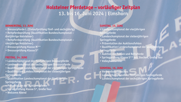 Hier wird Zuschauern so einiges geboten: Die Landeschampionate der vier- bis siebenjährigen Springpferde, der fünf- und sechsjährigen Dressurpferde sowie Qualifikationen zum Bundeschampionat für Reitpferde bereichern die Zeiteinteilung ebenso wie weitere hochkarätige Prüfungen in Parcours und Viereck bis zur schweren Klasse. Am Donnerstag, den 13. Juni, findet die Veranstaltung mit Dressurprüfungen und den Landeschampionaten im Viereck ihren Auftakt. Am Freitag, den 14. Juni, werden die ersten Qualifikationen der Parcours-Athleten ausgetragen. Am späten Nachmittag stimmen die Präsentation des Lots der Reitpferde-Auktion, ein S*-Springen und der Welcome Abend auf das vielseitige Wochenende ein. Am Samstagvormittag (15. Juni) werden nach spannenden Finalprüfungen die vier- und siebenjährigen Landeschampions geehrt und am Mittag gehört der Herbert-Blöcker-Platz den Auktionsfohlen, die sich live präsentieren, ehe am frühen Abend sowohl Reitpferde als auch Fohlen zur Versteigerung kommen. Nachdem der Abend wieder durch schweren Parcourssport abgerundet wird, tauschen die Sportler Reithosen gegen Shorts, wenn es im Volleyball-Turnier um Ruhm, Ehre und hochwertige Ehrenpreise geht. Am Sonntag, den 16. Juni, stehen die Holsteiner Stuten im Rampenlicht: Bei der Verbandsstutenschau wird Holsteins Beste aus der diesjährigen Eintragungstour auserwählt. Mit der Auszeichnung der „Holsteiner Stute des Jahres“ wird darüber hinaus eine besonders erfolgreiche Holsteinerin in der Zucht geehrt, die auch stellvertretend für die intensiv gepflegte Stutenbasis steht, auf die Holsteiner Züchter zu Recht so stolz sind. Im Anschluss machen die fünf- und sechsjährigen Springpferde ihre Landeschampions unter sich aus.