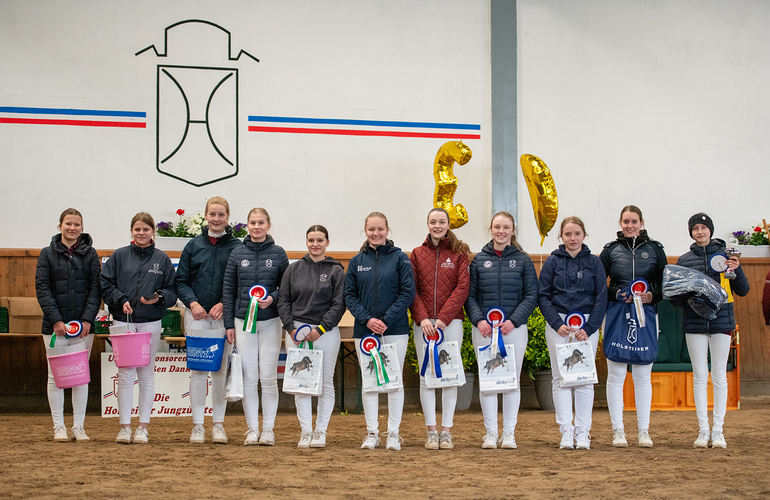 „Das besondere an den Holsteiner Jungzüchtern ist, dass wir eine große Gemeinschaft sind, die gemeinsam für das Holsteiner Pferd begeistert ist und das auch nach außen trägt“, freute sich die Jung- und Neuzüchterbeauftragte Frederike Schwarck über das harmonische Zusammentreffen auf dem Hof Reiherstieg. In Theorie, Mustern, Exterieur- und Freispringbeurteilung haben sich die zehn Clubs in vier Altersklassen gemessen und ihre Mannschafts- und Einzellandesmeister gekürt. „Dabei geht es eigentlich gar nicht erster Linie um das Gewinnen – obwohl das natürlich auch Spaß macht“, gibt Charlotte Micheel (Steinburg) lachend zu. „Wir dürfen uns in diesem Jahr über viele Neuzugänge freuen und sind eine echt coole Truppe. Wenn man jemandem etwas zeigen kann und wir alle zusammen sind, macht das mehr Spaß als alles andere.“ Ein gemeinsamer Spieleabend, eine Party und das 30. Jubiläum der Segeberger Jungzüchter machten den geselligen Teil des Wochenendes perfekt. Doch auch der Wettbewerb geriet nicht aus dem Fokus. Kim Gericke (Nordfriesland) war zum ersten, aber sicherlich nicht zum letzten Mal dabei: „Ich finde, man kann jederzeit und in jedem Alter noch einsteigen. Ich habe nun auch zum ersten Mal für den Theorieteil gelernt, aber wenn man sich für Pferde interessiert, fällt das gar nicht so schwer.“ In den praktischen Teilen gab es vor Ort noch letzte Tipps von den erfahrensten Kollegen, ehe man sich den Richtern Carina Wacks und Lukas Heumann stellte. Und dann wurde es noch einmal richtig spannend, als die Sieger und Platzierten der jeweiligen Altersklassen ihre wohlverdiente Ehrung und wertvolle Preise entgegennahmen.