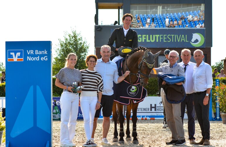 Mehrere Tausend Besucher waren auf die Anlage der Familie Johannsen nach Hörup gekommen, um bei bestem Sommerwetter das Finale des Springflut Festivals zu genießen. Denn das hieß: Spitzensport im Parcours, der mit dem Großen Preis der VR Bank Nord eG seinen absoluten Höhepunkt fand: 63 Athleten waren in dem Springen der Klasse S*** mit Stechen angetreten, immerhin 14 von ihnen empfahlen sich mit blitzsauberen Runden für den krönenden Abschluss.