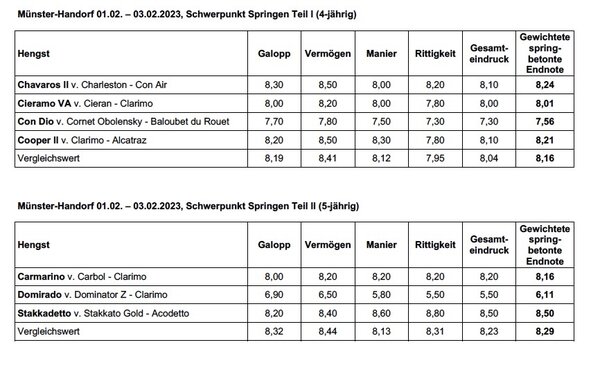 Aufgeführt sind alle Holsteiner Hengste – unabhängig von ihrem Körstatus beim Holsteiner Verband und vom Prüfungsergebnis. Das sind die Ergebnisse: