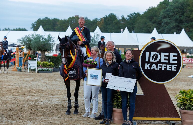 Bild: Der Bundeschampion der siebenjährigen Springpferde, Caillan v. Casall, mit Rolf Göran Bengtsson und seinem stolzen Züchter Gerd Ohlsen