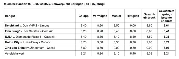 Es folgen alle Ergebnisse von Holsteinern in Münster-Handorf, unabhängig von ihrem Körstatatus beim Holsteiner Verband. Mit * gekennzeichnete Hengste sind nicht beim Holsteiner Verband gekört: