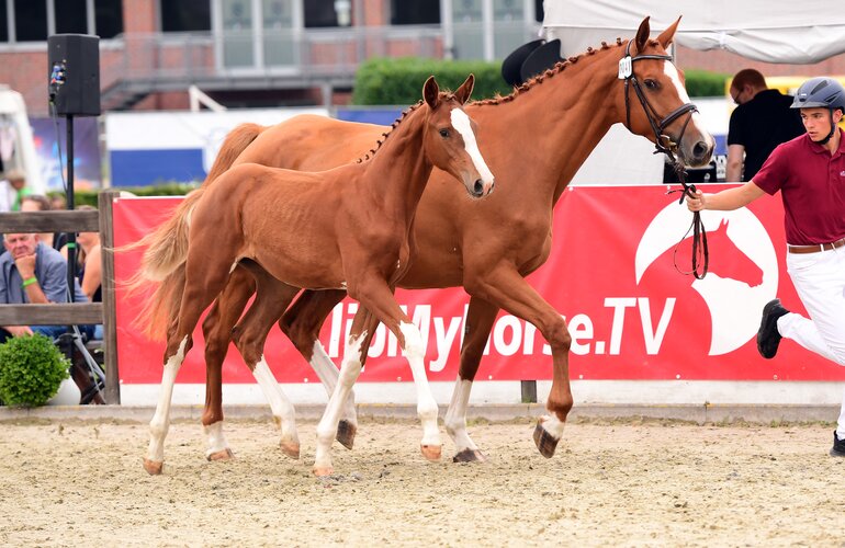 Zum Spitzenpreis wurde die Katalognummer 41 zugeschlagen. Bei diesem Fohlen handelt es sich um eine Tochter des einstigen Holsteiner Siegerhengstes Esmeraldo aus einer Mutter des legendären Cor de la Bryère-Quidam de Revel. Philipp Schwartz-Hafter aus Hochdonn ist Züchter und Aussteller der Fuchsstute, die für 23.000 Euro an Kunden aus Sachsen verkauft wurde. Für 21.000 Euro wechselte die Katalognummer 51, Quel Cherie v. Quel Homme de Hus-Contendro I-Claudio von der Zuchtgemeinschaft Haß & Wencke Haß, Herzhorn, in französischen Besitz. Das sportlich aufgemachte Stutfohlen aus dem Stamm 890 überzeugte auch mit hocherfolgreicher Verwandtschaft, wie zum Beispiel C.T. v. Casall (Hugo Simon/Tina Deuerer) und Castilly v. Casall (Thomas Brandt). Ebenfalls hohe Begehrlichkeiten weckte die Katalognummer 13. Hierbei handelt es sich um eine Tochter des Cascadello I a.e. Zirocco Blue-Colman-Mutter aus dem Stamm 730B (Michael Peters, Wöhrden). Rascadella Blue – so der Name der sympathischen Fuchsstute – kostete 18.000 Euro. Einen imposanten Hengstanwärter v. Diamant de Semilly-Balou du Rouet-Casall aus dem Stamm 749 (Sören Brühe, Seeth-Ekholt) sicherten sich Kunden aus Schleswig-Holstein für 17.000 Euro mit der Katalognummer 31, Dark Diamond.