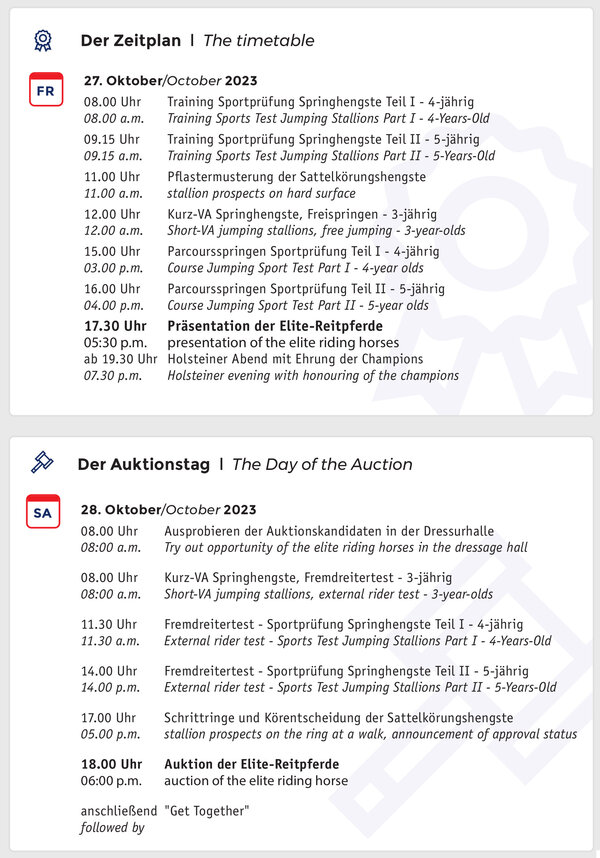 Von allen Kandidaten der Elite-Reitpferdeauktion finden Sie ausführliche Informationen, Videos, Fotos und Verwandtschaftsleistungen unter www.holsteiner.auction. Auch die Videos der Auftaktpräsentation sind dort online. Noch bis Dienstag, den 24. Oktober 2023, können die Elite-Reitpferde ausprobiert werden. Wenden Sie sich gerne telefonisch an das Auktionsteam zur Terminabsprache: Felix Flinzer (0162-3493942), Alexandra Bitter (0170-3825465) oder Sigrun Günther (0163-2469320). Im Anschluss werden den Pferden einige Ruhetage gewährt, ehe am Morgen des Auktionstags die letzte Chance zum Probereiten ist, ehe die Auktion um 18:00 Uhr im Hybrid-Format startet.