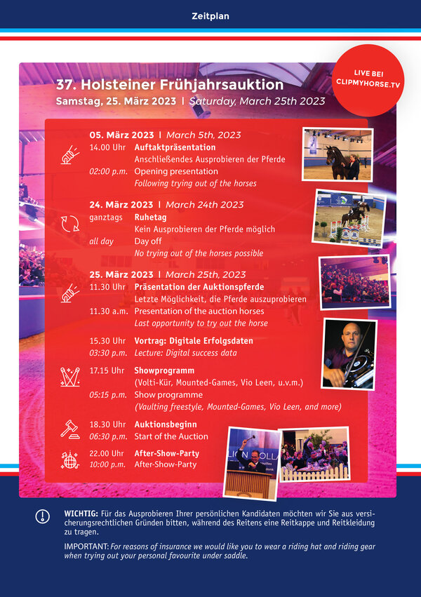 Am vergangenen Wochenende haben die Reitpferde der Holsteiner Frühjahrsauktion am 25. März ihren ersten öffentlichen Auftritt mit Bravour gemeistert. Ab sofort können sie nach Absprache jederzeit ausprobiert werden. Und dann dauert es nicht mehr lange, bis in der Fritz-Thiedemann-Halle wieder der Auktionshammer fällt – im Anschluss an ein hochinteressantes Rahmenprogramm, das Zuschauer herzlich willkommen heißt.