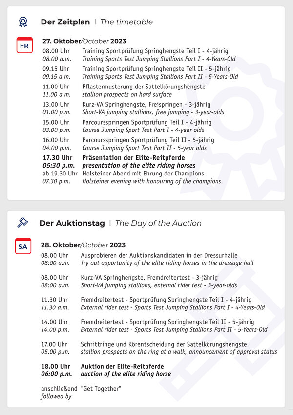 Die Liste über Eigen- und Verwandtschaftsleistungen der Holsteiner Elite-Reitpferde ließe sich noch lange weiterführen, noch weitaus überzeugender dürfte ein Live-Eindruck der Kollektion sein. Am Sonntag, den 8. Oktober, um 15 Uhr präsentieren sich die Pferde in der Elmshorner Fritz-Thiedemann-Halle. Einen Livestream überträgt ClipMyHorse.tv. Im Anschluss beginnt die Zeit des Ausprobierens, ehe am 28. Oktober ab 18 Uhr der Hammer fällt. Die Auktion steht unter dem Motto „Holstein meets Italy“ und verbindet klassischen Holsteiner Charme mit den Vorzügen der mediterranen Küche, Musik und passendem Ambiente. Der Eintritt zur gesamten Veranstaltung ist frei. Fragen zu den Pferden, dem Ablauf des Ausprobierens und der Auktion beantwortet Felix Flinzer (Telefon: 0162-3493942) gerne. Alle Kandidaten sind online unter www.holsteiner.auction mit Fotos, Videos und Verwandtschaftsleistungen zu finden.