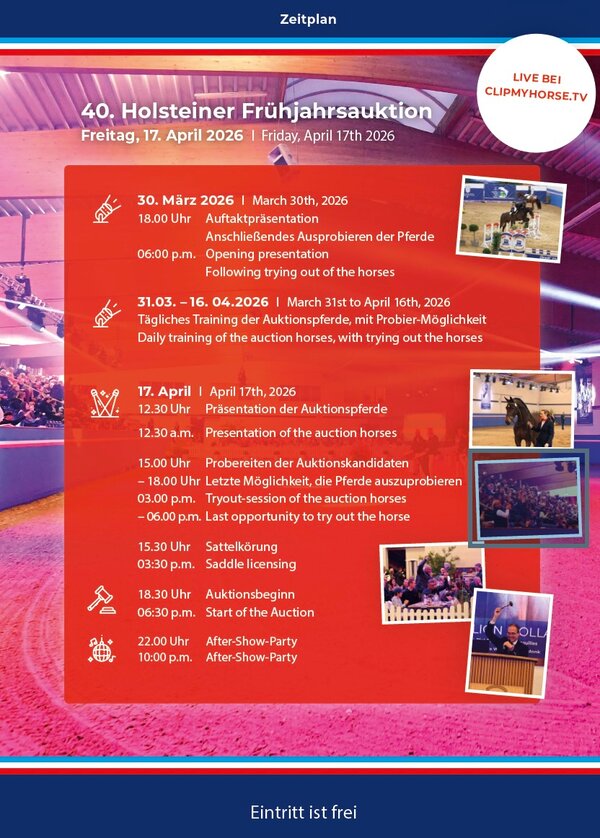 Mit dieser vielseitigen Kollektion knüpft der Holsteiner Verband an seine bewährte Auktionsphilosophie an: qualitätsvolle, sorgfältig ausgewählte Nachwuchspferde anzubieten, die sowohl für den gehobenen nationalen als auch für den internationalen Springsport interessante Perspektiven versprechen. Die Frühjahrsauktion in Elmshorn bietet damit einmal mehr eine attraktive Plattform für Züchter, Reiter und Investoren aus dem In- und Ausland.