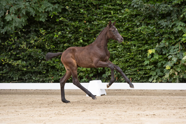 Hopes and expectations for Chezarro’s future are very high in view of his impressive quality as to rideability, bascule and technique demonstrated in the stallion performance test and his outings in competition. Having won young horse jumping classes in 2022, he is to continue his career under saddle in the youngster tour. Chezarro impressively combines willingness to perform and that special bloodhorse flair. Boasting a very well-constructed top line, he is also a particular attractive eye-catcher thanks to his dark coat and distinctive markings. His basic gaits are of extraordinary quality with the dark bay always displaying an up-hill tendency with good rhythm and active hind leg. Chezarro’s jumping lives up to his breeding, as he is very careful and demonstrates great intelligence and extraordinary quality as well as most impressive ability.