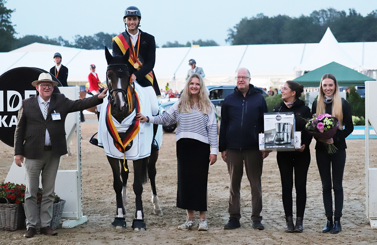 The first championship title from Warendorf in the jump-off goes to Holstein: The Chin Champ-Quality son Con Quality bred by Hartmut Knop jumped to victory with Richard Vogel in the saddle in an incredibly fast jump-off round - as the last starter and that although the clock started ticking tenths of a second before the first jump - pure suspense on the Burandtwiese in Warendorf. Hartmut Knop from Gilde proudly accepted the honor for the first champion from his breeding: "My heart was really pounding in the final and even more so in the jump-off," said Knop, who had sold Con Quality as a foal and has followed his development closely ever since.