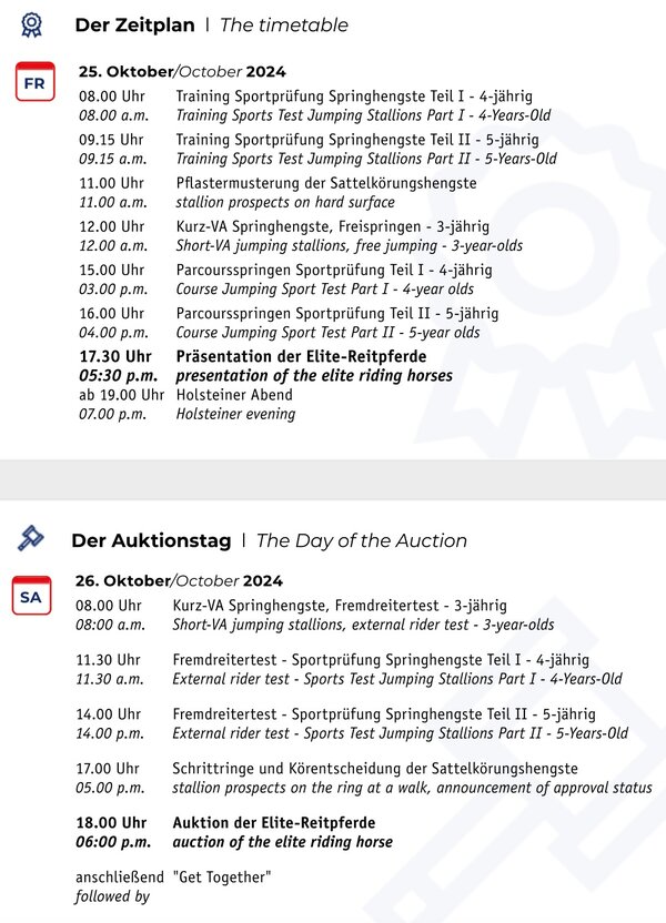The get-together on Saturday evening is all about the sociable part of the weekend. DJ and electric violinist Vio Leen will provide the right mood. The collection of auction horses is online on www.holsteiner.auction . Do not hesitate to call Felix Flinzer for any questions about the auction horses (+49 162-3493942). The entire autumn event will be streamed live on ClipMyHorse.tv.