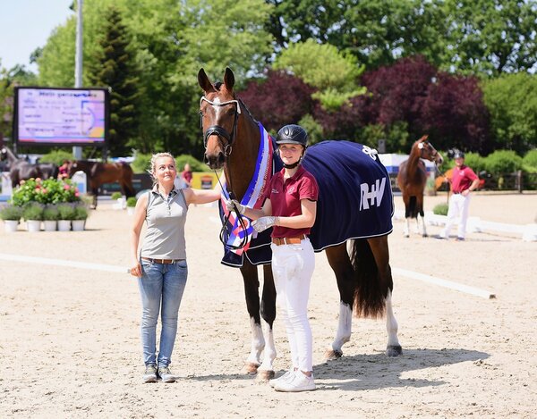 Friday morning saw the first 2023 state champions crowned in the Herbert-Blöcker-outdoor arena. In the five-year-old group, Sir Mystic EA by Sir Donnerhall-Fürst Heinrich (Elisabeth Christina Ahn-Ballies, Grebin) outperformed the competition in a young dressage horse class at L level. Under the saddle of Laura Wilms, the black gelding trotted to receive a total score of 8.2 and had the coveted oak wreath put around his neck at the championship award ceremony, while Questore by Quantensprung-Lorentin I (Claus-Heinrich Petersen, Ahrenviöl) secured the silver medal (7.7). Jan Lens had taken to the saddle for Fohlenhof stud. Caramel by Caracho-Aljano (Sönke Wilhelm Thamling, Kollmar) was ranked on bronze position, with the bay mare saddled by Paula de Boer and a total score of 7.5. The award ceremony of the state championship of the six-year-old dressage horses was headed by Black Jack JG by Bon Coeur-Hofrat (Joana Graf, Bargfeldt-Stegen). Kaddur Kelkha rode the black stallion to score a mark of 7.8, while Fiorino Hit EA by Fürst Romancier-Licotus (Elisabeth Christina Ahn-Ballies, Grebin) came second (7.5) with Laura Wilms. The bronze medal (7.5) was awarded to Belle de Jour by Bon Coeur-Lorentin I (Nicole Hägler, Leonberg) with Christian Busse by the judging panel comprising Gabriele von Appen, Tanja Konopka and John Mc Cormack.