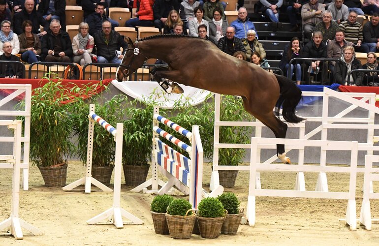 Exceptional sire Casall is being represented by the most offspring with six of his sons demonstrating their quality in the free jumping chute. Other C line representatives include several offspring by Cascadello I, Clarimo, Colman, and Cornet Obolensky. Among the selection’s gems are also stallion candidates by Diamant de Semilly, his sons and grandsons, which have founded a sire line of their own over these past years in Holstein. The blood of Uriko and his son, United Way, is also widely represented. The last named had already had the most offspring at the preselection. “Already the presentation on hard surface has been an indication of the high general quality and correctness of the age group born in 2020. This impression was continued at today’s free jumping. The free jumping team around Alexandra Bitter contributed to the cool and laid-back performance shown by many of the colts“, breeding director Stephan Haarhoff said afterwards. “It was also very gratifying to have a crowd of about 2000 people clapping and cheering on the performances in the Holstenhall.”