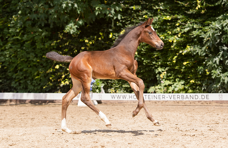 Not only does the foal collection string together the who is who of major sires and up-and-coming stallions, but also the dam lines prove very impressive with regard to their performance record: Third dam to lot 38, Ernesto by Eldorado van de Zeshoek-Calido I, is world champion and Olympic horse Taggi by Landgraf I (Sören von Rönne/GER), whose produce includes Cartani, the licensed stallion successfully shown at 1.60m level by Charlotte von Rönne (GER). Lot 65, Victory by Vigado-Sandro Junior, is closely related to Coolio (by Casalito), a highly decorated international competitor under the saddle of Marcel Marschall (GER). Victory’s second dam is dam to Marschall’s current no.1 horse, which was on the bronze-winning German team in the Nations Cup of St. Gallen (SUI). Lot 36, by Dourkhan Hero Z-Cayado is called Douglas: this attractive colt is a half-brother to the 2023 Holsteiner champion stallion, Diamantado by Diamant de Semilly. Lot 8 is a very interesting option as well: the rare colt by Carthago out of a Toulon dam boasting own results at S level, is aptly named Carpe Diem.